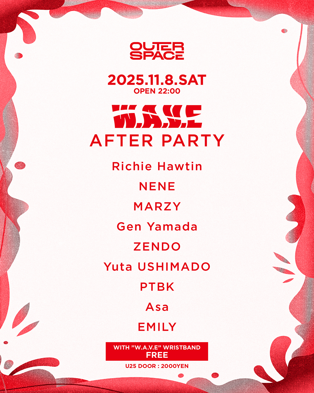 OPEN 22:00 / CLOSE 7:00 WITH ”W.A.V.E”WRISTBAND:FREE UNDER 25 : 2000YEN